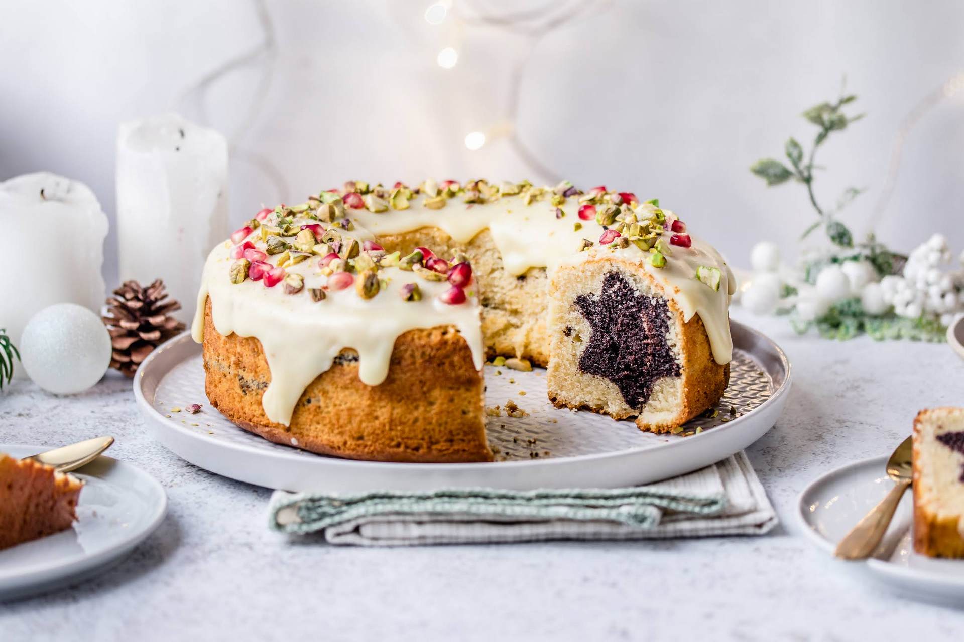 Pecite kolač u prethodno zagrijanoj pećnici na 180 stupnjeva oko 45 minuta ili dok test čačkalicom ne pokaže da je gotovo. Pečeni kolač izvadite iz pećnice, hladite ga petnaestak minuta u kalupu, a zatim ga pažljivo preokrenite na rešetku i izvadite iz kalupa. Ostavite ga da se potpuno ohladi pa ga prelijte bijelom čokoladom, posipajte ga sjeckanim pistacijama, zrncima nara i poslužite.